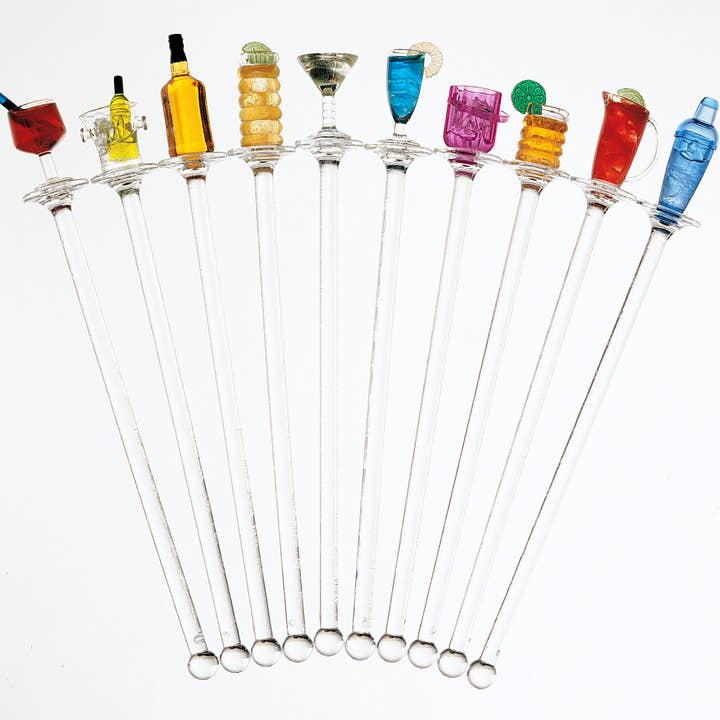 Realistic looking, hand decorated miniature cocktails and bar accessories top these “hit of the party” swizzle sticks.
