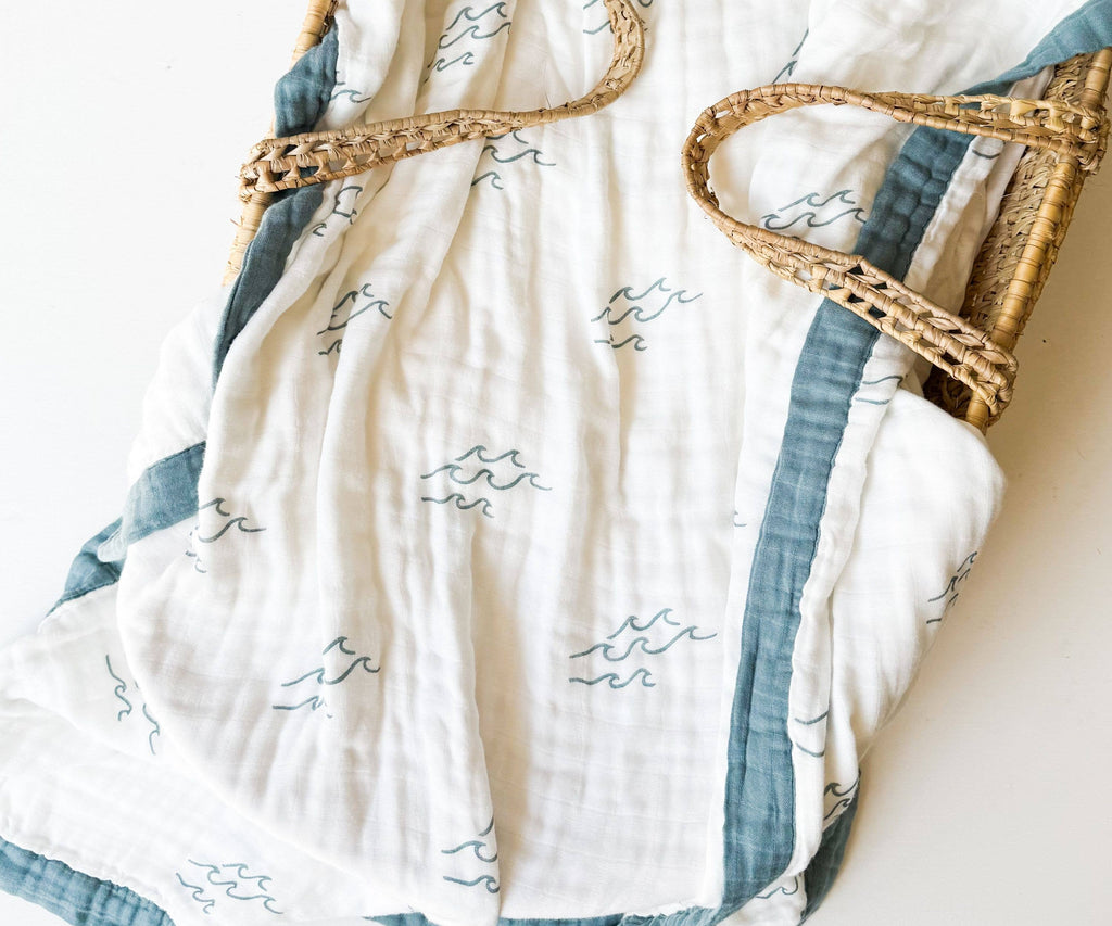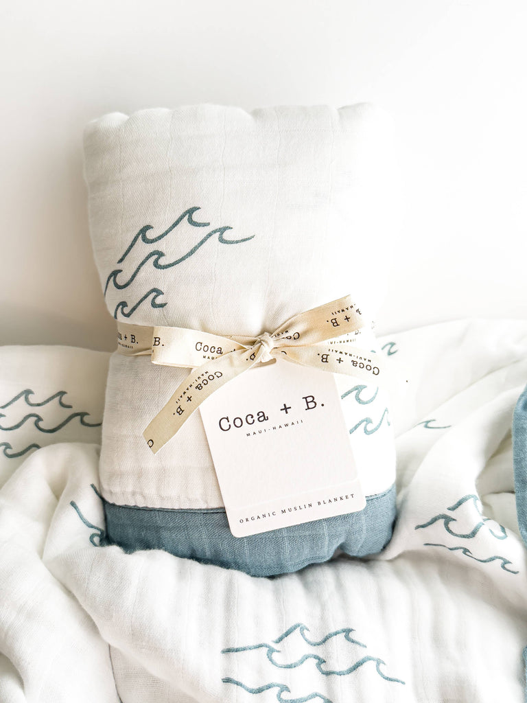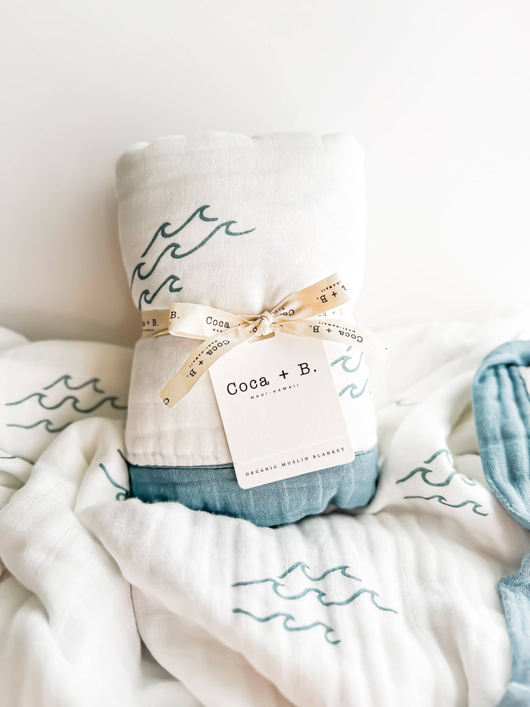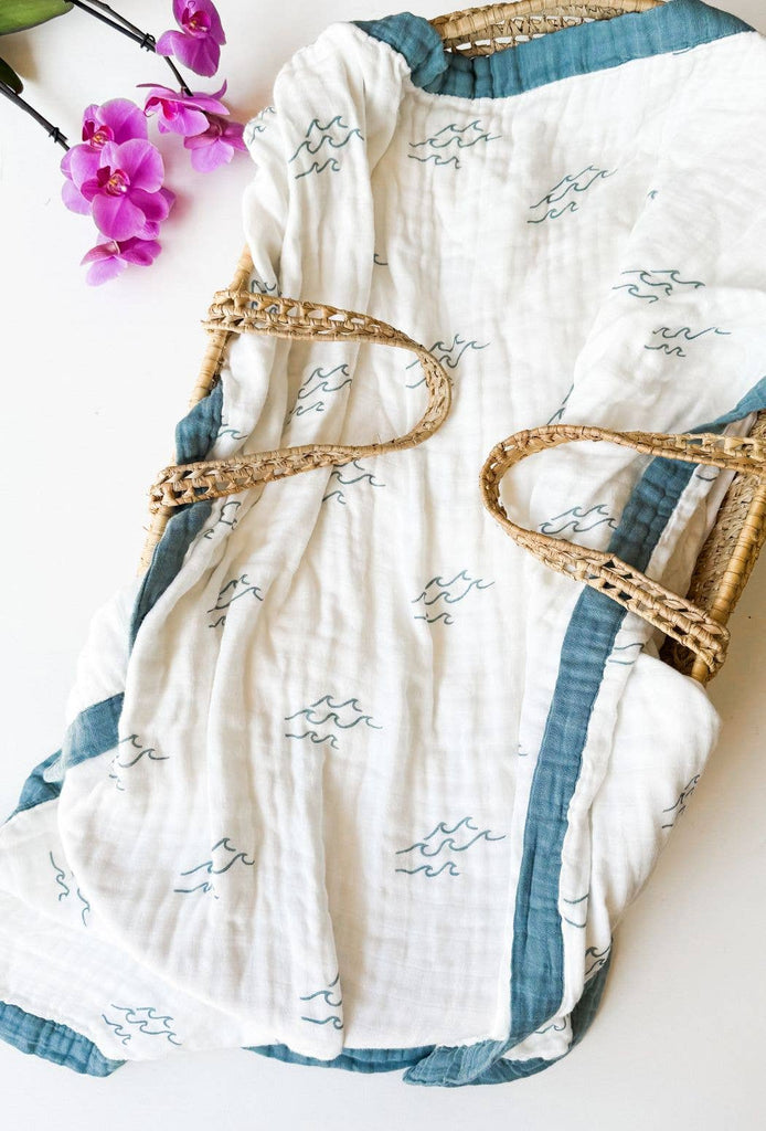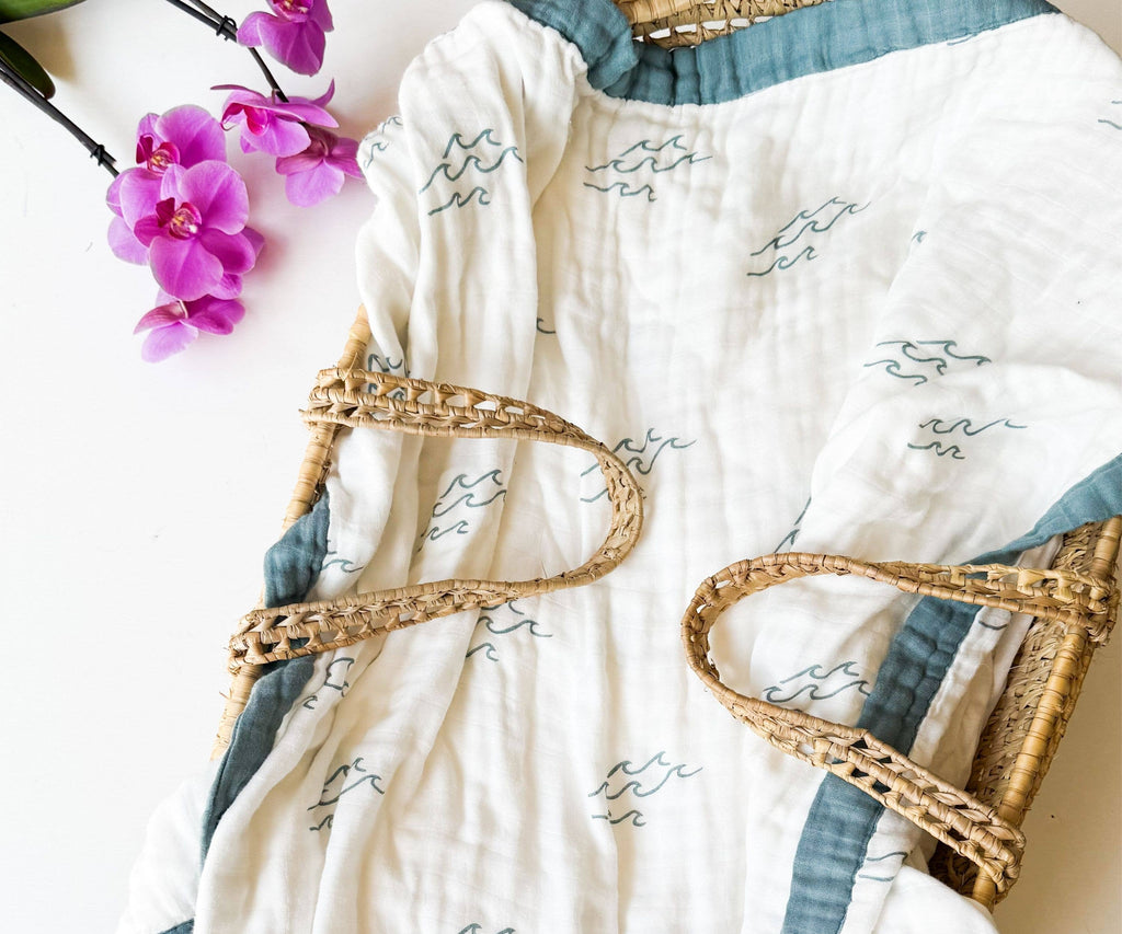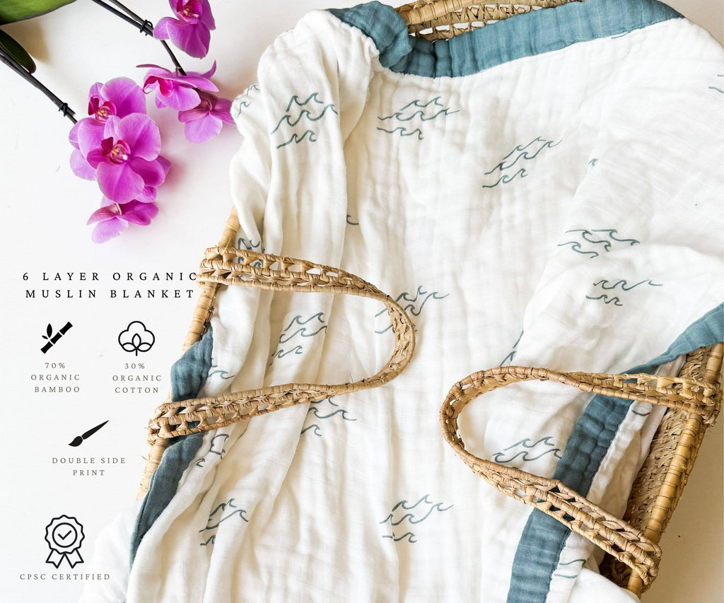 Our Wave Print Muslin Baby Blanket offers 6 incredibly soft layers of added warmth and comfort while still maintaining that incredibly buttery softness bamboo is known for.  Not only incredibly cozy, breathable, midweight, and moisture-wicking but its sustainable organic bamboo + cotton fabric also helps preserve our environment. With a little extra weight, it's perfect for cooler environments. Each blanket is beautifully packaged in eco-friendly organic cotton ribbon with deluxe cardstock and ready to gift.