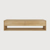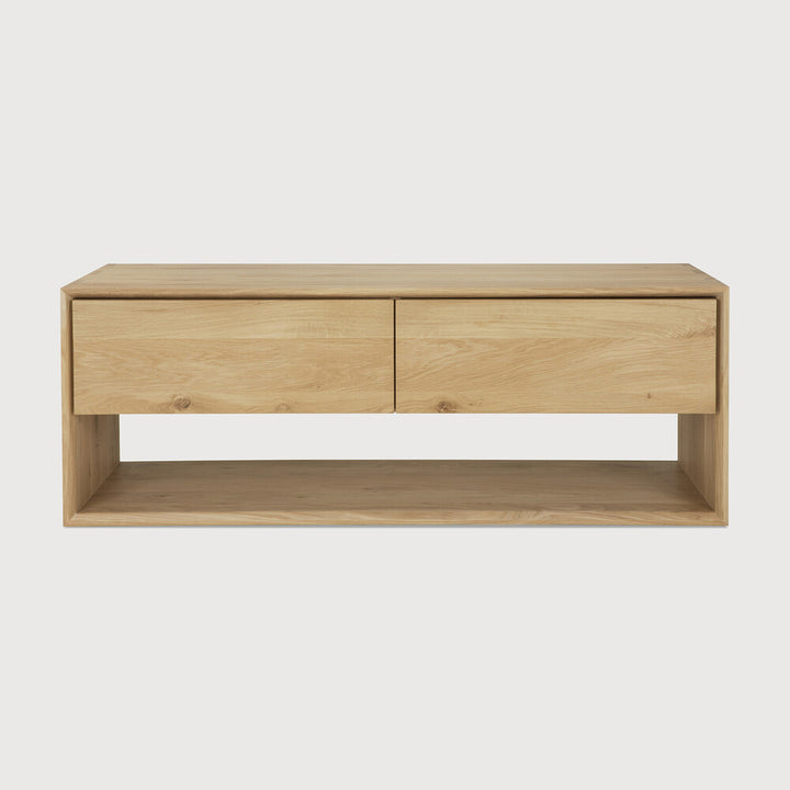 The oak Nordic TV cupboard features 1 flip-down door and 1 drawer.