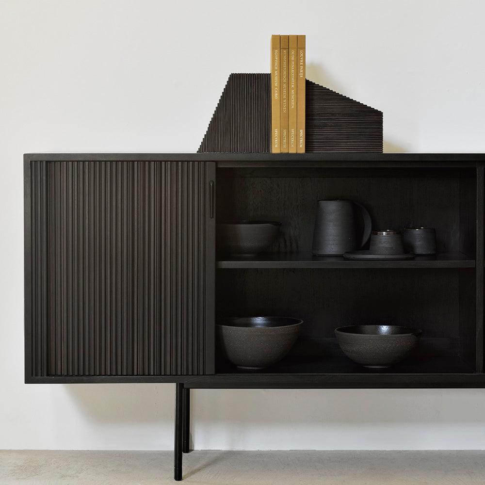 The Roller Max sideboard offers functional storage in an eye-catching modern design. Featuring mahogany sliding doors, adjustable shelving, and seamlessly integrated handles in a solid teak body with understated teak legs. The result is a minimalist and contemporary storage furniture piece for any room in your home. Designed by Alain van Havre.