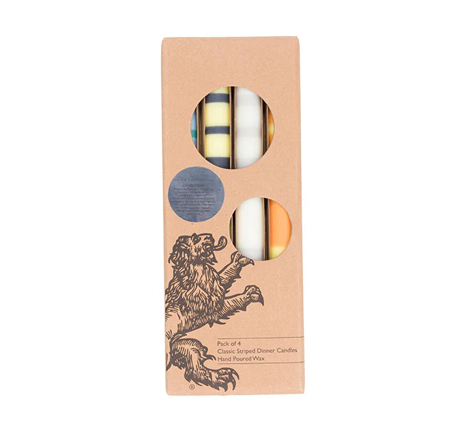 Our eco, Fair Trade, hand poured dinner candles are solid layers of colour here in a new array of British Colour Standard archival, colourful stripes.