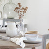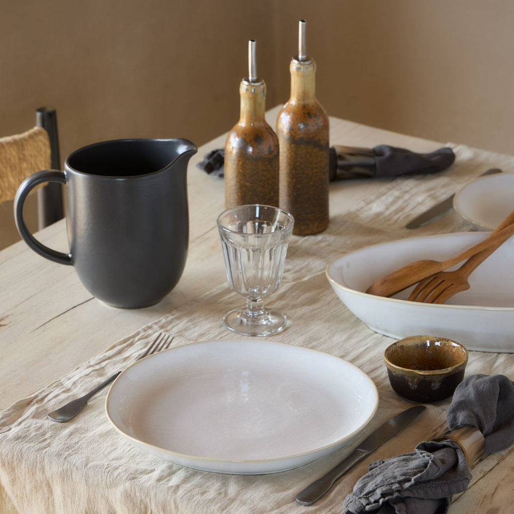 The Costa Nova Brisa Dinner Plate is inspired by the warm breeze that blows from the east and imbues the Algarve coast with fruity aromas and the fresh flavors of Ria Formosa. The blended white and blue glazes and organic shapes transport you to the beautiful landscape of lagoons, canals, salt works, and sandy beaches stretching across deserted islands. This collection adds light to every gathering and turns any table into a memorable experience. Made in Portugal.