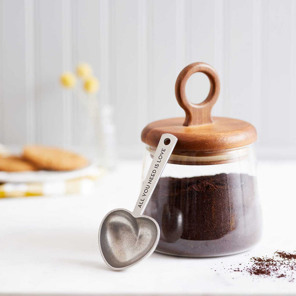 Coffee lovers in a hurry rejoice - this 2 TBS scoop is made for you! Inscribed with the words "all you need is love" on the front and "and more coffee!" on the back. It's the perfect gift for the coffee lover in your life! Guaranteed to brighten up your mornings and your kitchen. Inspired by the vintage kitchenware we love, we designed this spoon to be sturdy, useful, and stylishly happy.