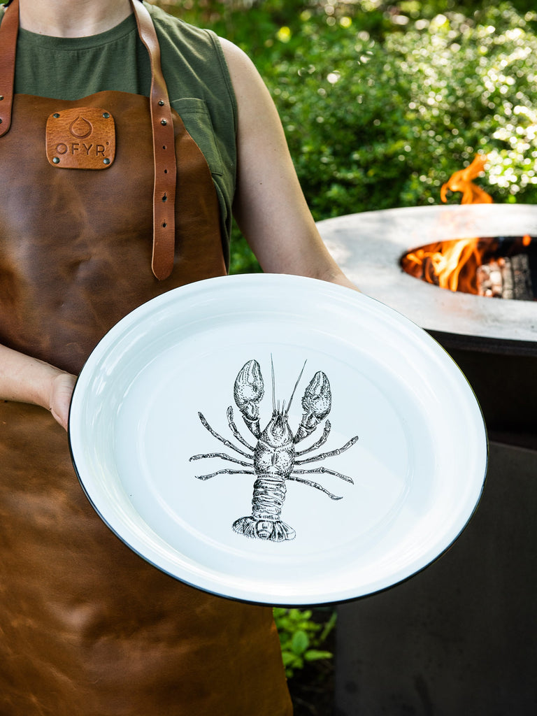 A Weston Table exclusive giant eco-friendly enamelware lobster themed round tray for entertaining. Fill with crushed ice and use as a bed for serving shrimp, oysters, mussels or other seafood. Alternatively, pile high with freshly grilled meats or vegetables.