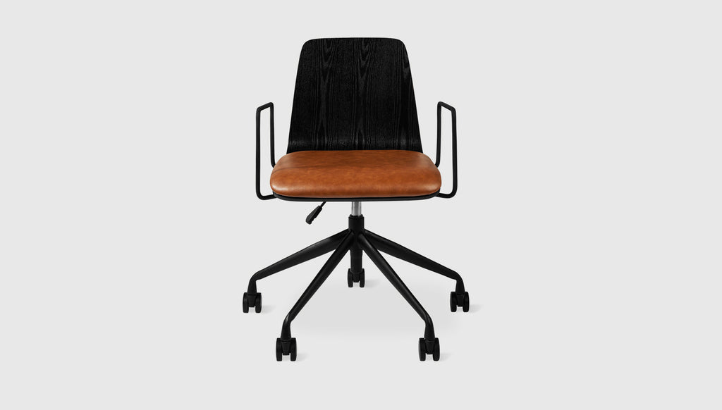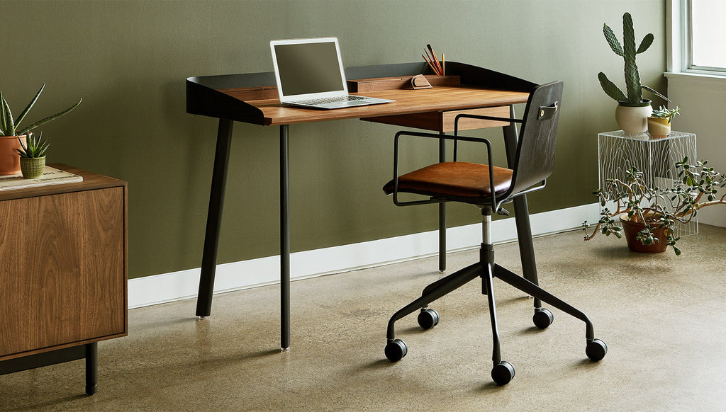 Take a spin in the Lecture Task Chair’s supportive swivel frame and you’ll start to view your workspace from a new perspective. This lightweight, formed-plywood desk chair is equal parts style and functionality with a padded seat cushion and curved back for ergonomic support. Rising to meet your highest standards, Lecture features an easy-to-use seat adjustment lever that lifts you comfortably to meet any desk or table. Five legs for stability and five stars for its ability to modernize your workspace.