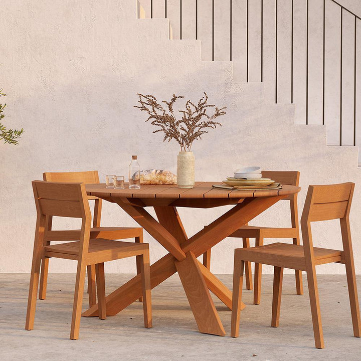 A popular interior favorite, the EX 1 dining chair in solid teak is a timeless design, adding effortless stability to your outdoor seating needs.