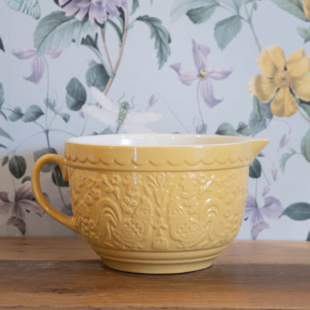Welcome a touch of farmside joy to everyday food prep tasks with the Mason Cash Home to Roost Collection Batter Bowl. Made with Mason Cash's time-honored earthenware that is resistant to chipping and cracking, this mixing bowl will be a durably elegant addition to your everyday baking preparation.With a 2 Qt capacity and a convenient handle and spout, this mixing bowl makes it easy to prepare and pour thinner mixtures, such as cheesecake filling, cake batter, brownie batter, and more. The bold yellow-colored finish is highlighted with an embossed floral rooster & hen design that lines the bowl's perimeter, while the classic scalloped rim offers maximum grip - making for a practical, elegant piece that will let mixing tasks go smoother. Order the Mason Cash Home to Roost Collection to welcome a touch of country charm to your kitchen.