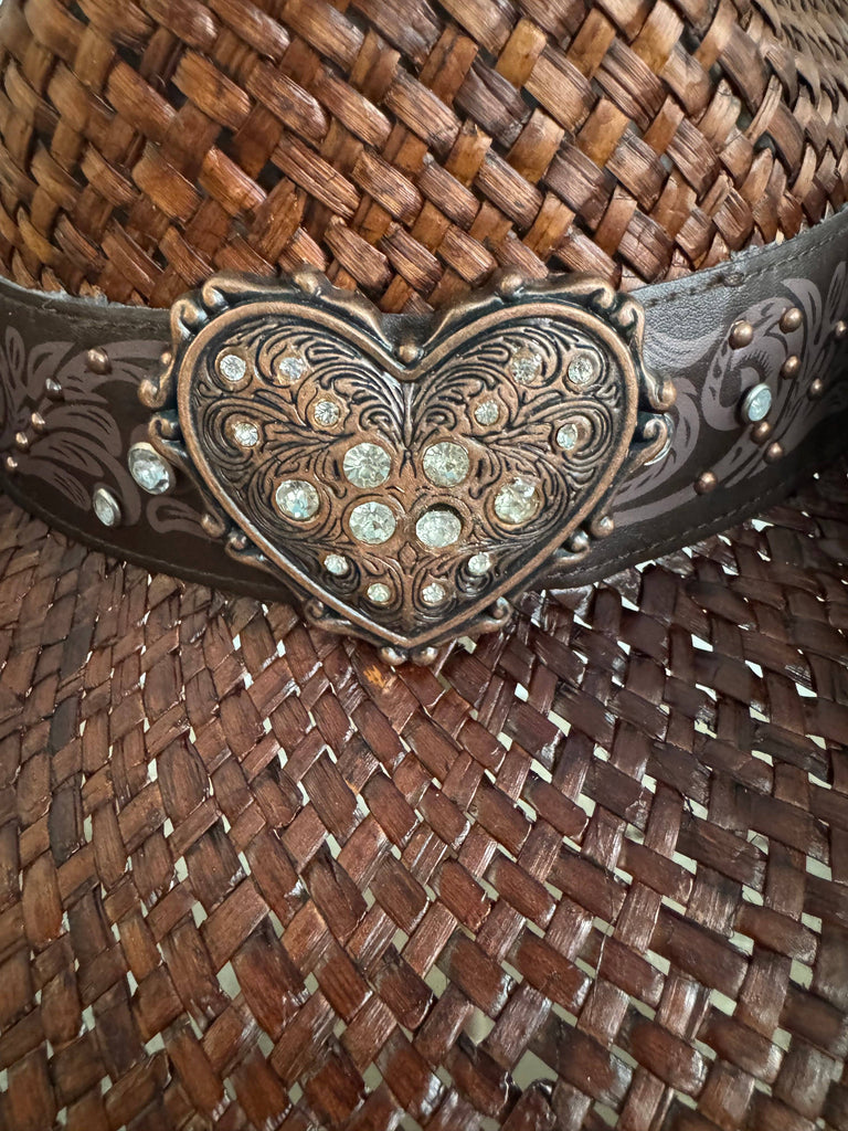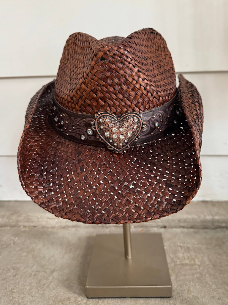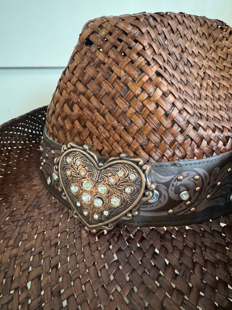 Top off your cowgirl look with this adorable brown straw hat!