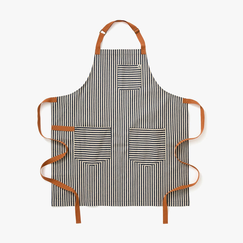 With navy and white stripes and ochre-toned straps, The Essential Apron in Palm oozes effortless cool. Offset stripes on the pockets add a dose of unexpected sophistication, bringing a touch of Op Art chic. Bonus points if you “forget” to take it off at dinner—this apron is just as cool as whatever you’re wearing underneath.