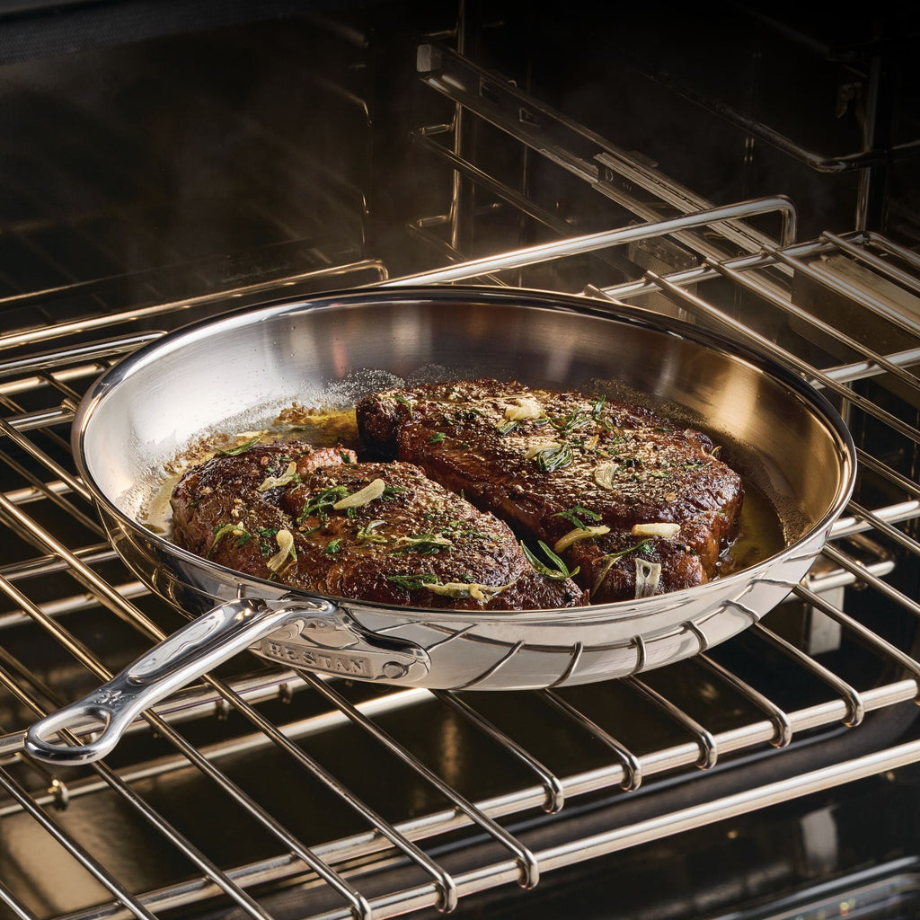 Built to shine, ProBond® Luxe also boasts superior tri-ply clad stainless steel construction for lifetime warp-resistance. Hestan's signature sealed rims prevent delamination and offer dishwasher-safe convenience. Each vessel is induction-suitable, helping you unlock true heat performance, while raising the bar for innovation with seamless handles designed by Michelin-star awarded Chef Thomas Keller that eliminate the food-trapping crevice, and are finished with smooth flush rivets for easy cleanup. Oven and broiler safe to 600ºF.