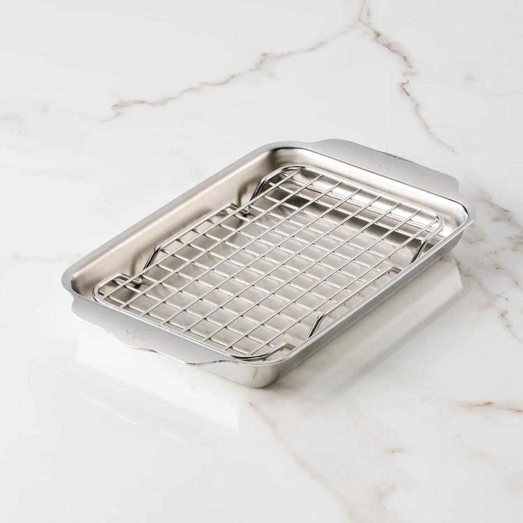 Introduce exceptional craftsmanship and lasting performance to the kitchen with the Hestan Provisions OvenBond Stainless Steel Eighth Sheet Pan and Rack Set. The mini but mighty eighth sheet pan is crafted from triple-bonded clad stainless steel with a responsive aluminum core designed to emit heat evenly, producing beautifully browned goods and perfectly roasted foods, while the roasting and cooling rack is crafted from stainless steel making it oven and dishwasher safe.
