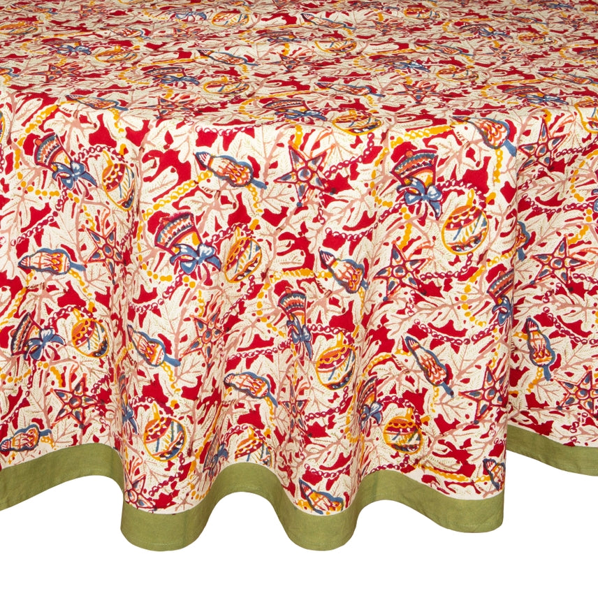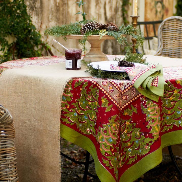 Combining a sense of casual festivity and tradition, this finely crafted French linen is a feast for the eyes with its array of finely detailed Christmas decorations. Featuring a holiday-themed pattern with an understated edge, these French linen tablecloths brighten any room with simplicity and charm. All of our linens are handprinted by skilled artisans using a time-honored technique.