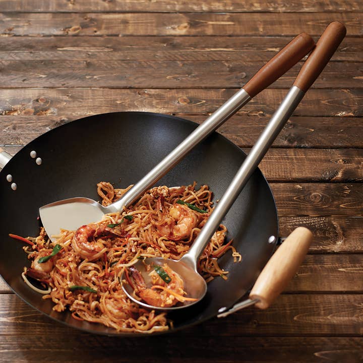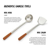 • NEW AND IMPROVED DESIGN: Rosewood handles have been nailed in place so they will not slip or fall off. This set is smaller and sturdier than previous sets so that is better for everyday use. The chuan spatula is built to efficiently scoop and flip stir fry and REACH all parts of a wok, while the hoak soup ladle is built to reach all the liquids.