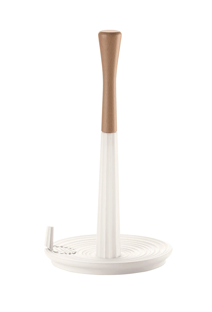 Roll&Tear is a universal kitchen roll holder with a sheet retainer pin made from post-consumer recycled plastic with wooden details. Roll&Tear is made from a special antibacterial material that creates a protective barrier on its surface, drastically reducing bacteria proliferation. It also features an adjustable sheet retainer pin, which adapts to the roll diameter to guarantee neat tearing and ensure the roll cannot unwind accidentally. Easy to refill, handy, quick and easily portable, it is ideal for rolls of paper of different diameters and heights. Made in Italy.