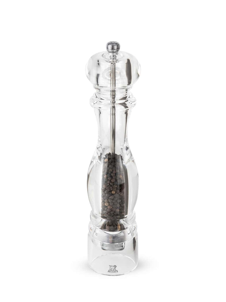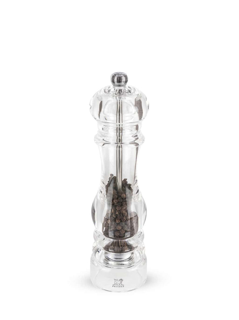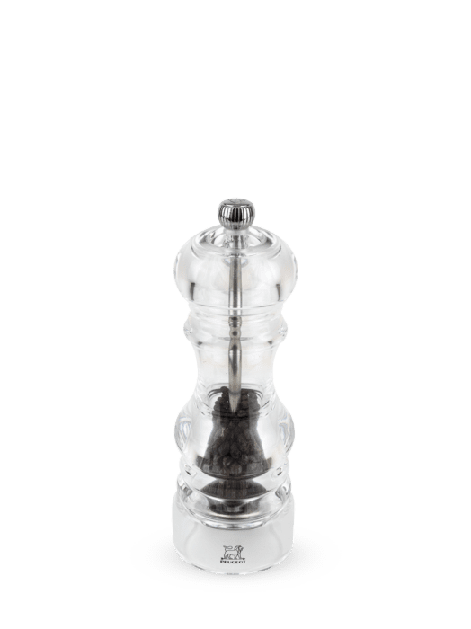 In their transparent showcase, the peppercorns or salt held within the Nancy mill are an invitation to an adventure through flavors. With its timeless design, the Peugeot Nancy mill is essential for the table and the kitchen. Produced entirely in acrylic, it shows off its contents and means that the reservoir being empty is never a sudden surprise. The adjustment knob, placed on the top of the mill, is used to adjust grinding precisely, from the finest to the coarsest, to exactly match the flavors that you want.