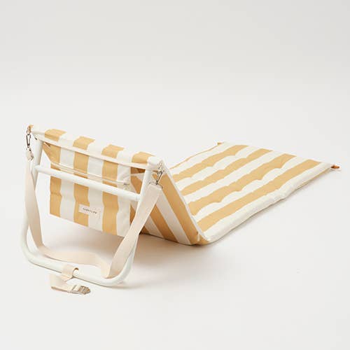 Recline in comfort with the ultimate outdoor chaise. The Mango Bay Recliner is extremely comfortable and chic for long days spent under the sun. Made from durable, water and fade resistant cushioned cotton canvas and featuring an adjustable backrest for extra comfort, relaxing has never been so easy. From beach to park to pool, simply fold it out on any surface and claim your sunshine with its vintage look. Soak up your surroundings in style with its golden mustard maxi stripe print that will have you mesmerised all day long.