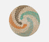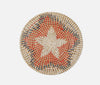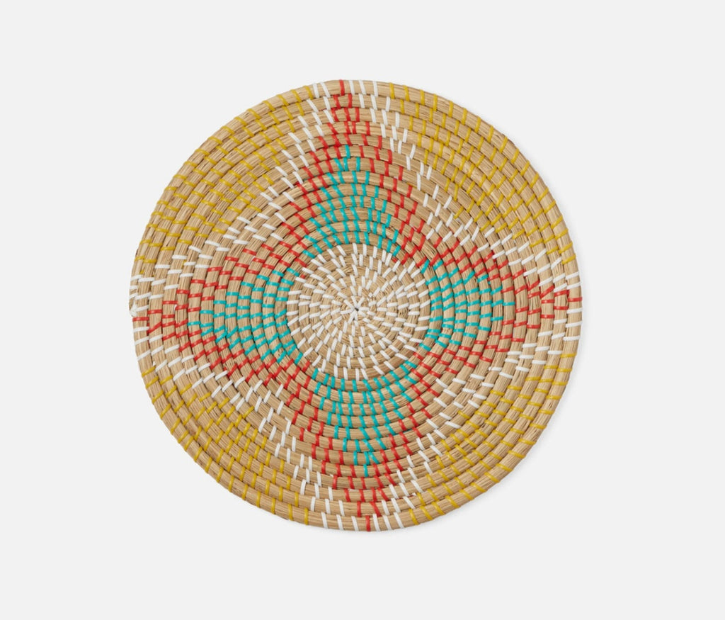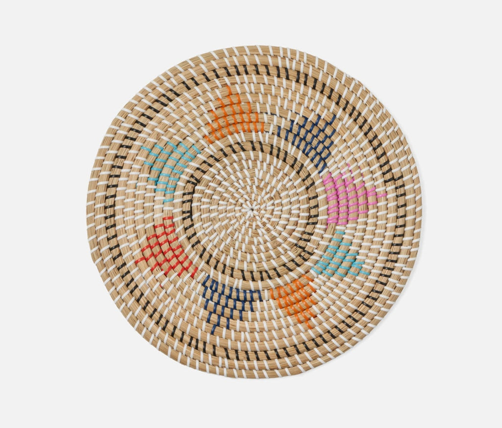 Each piece is handwoven from bundles of natural seagrass accented in seagrass strands dyed brilliant red, teal, white, and yellow.
