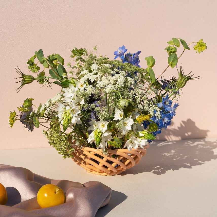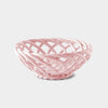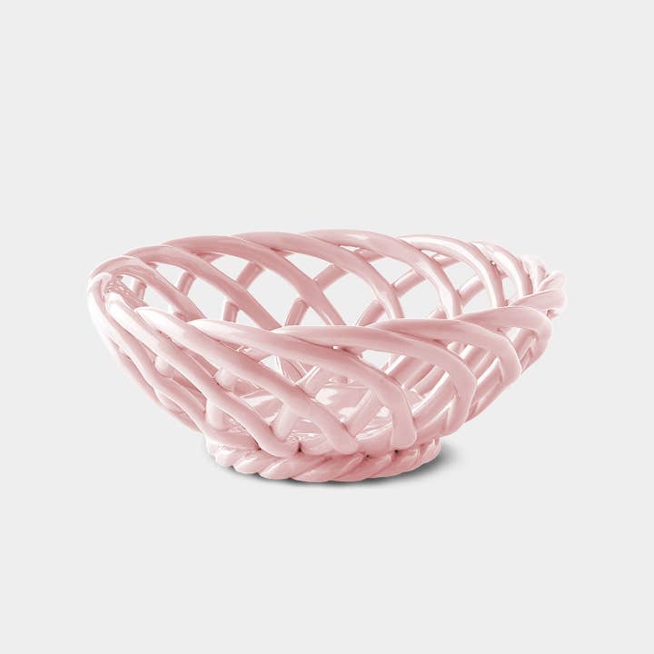 Each basket is made of delicately woven earthenware, creating a striking swirled pattern. This visual fluidity is enhanced by a fine, glossy glaze in contemporary colors.