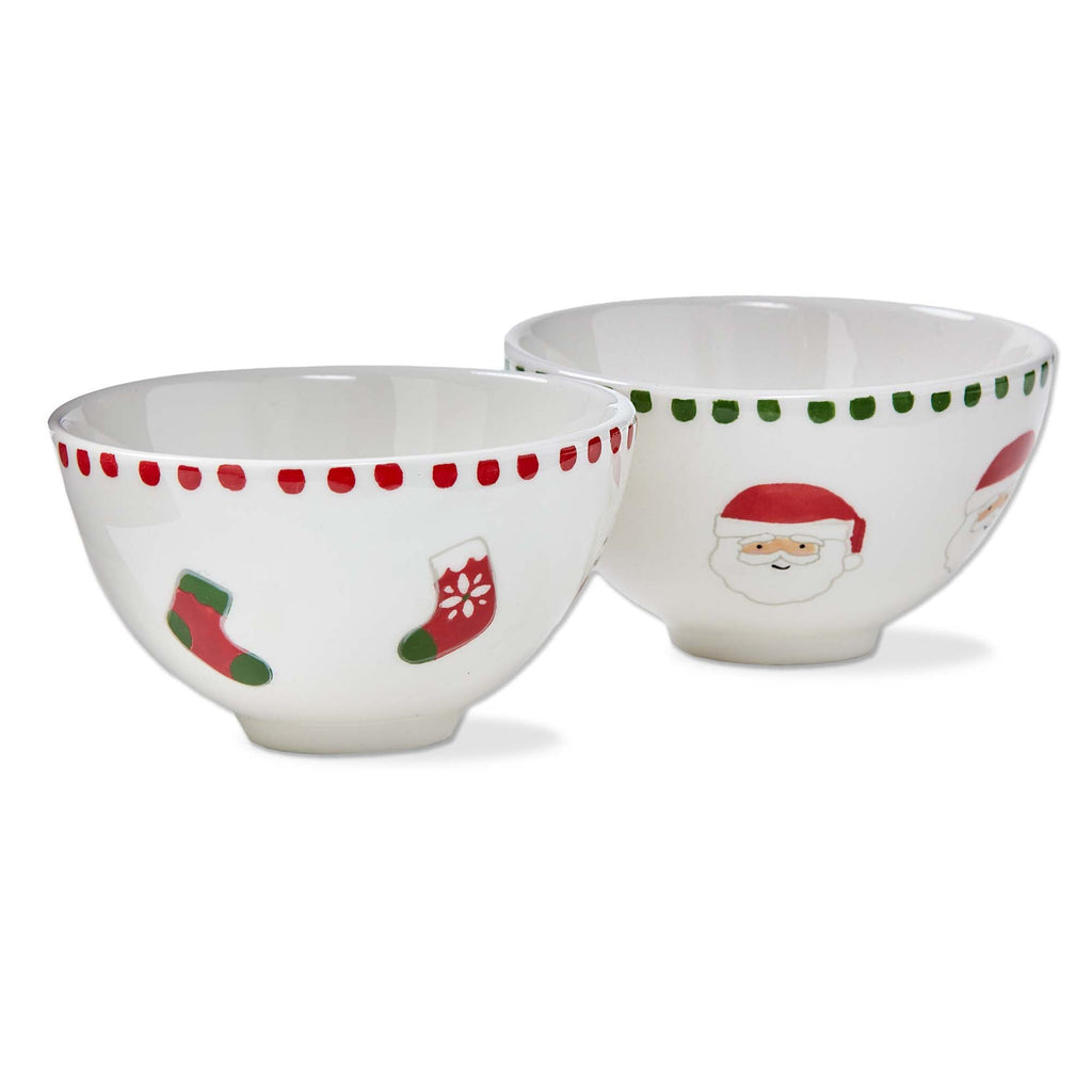 Spread holiday cheer with this festive Holiday Cheer Snack Bowl Set. This earthenware bowls features a classic white design, with one bowl adorned with Santa faces and the other with stockings. Perfect for serving snacks, dips, or desserts.