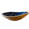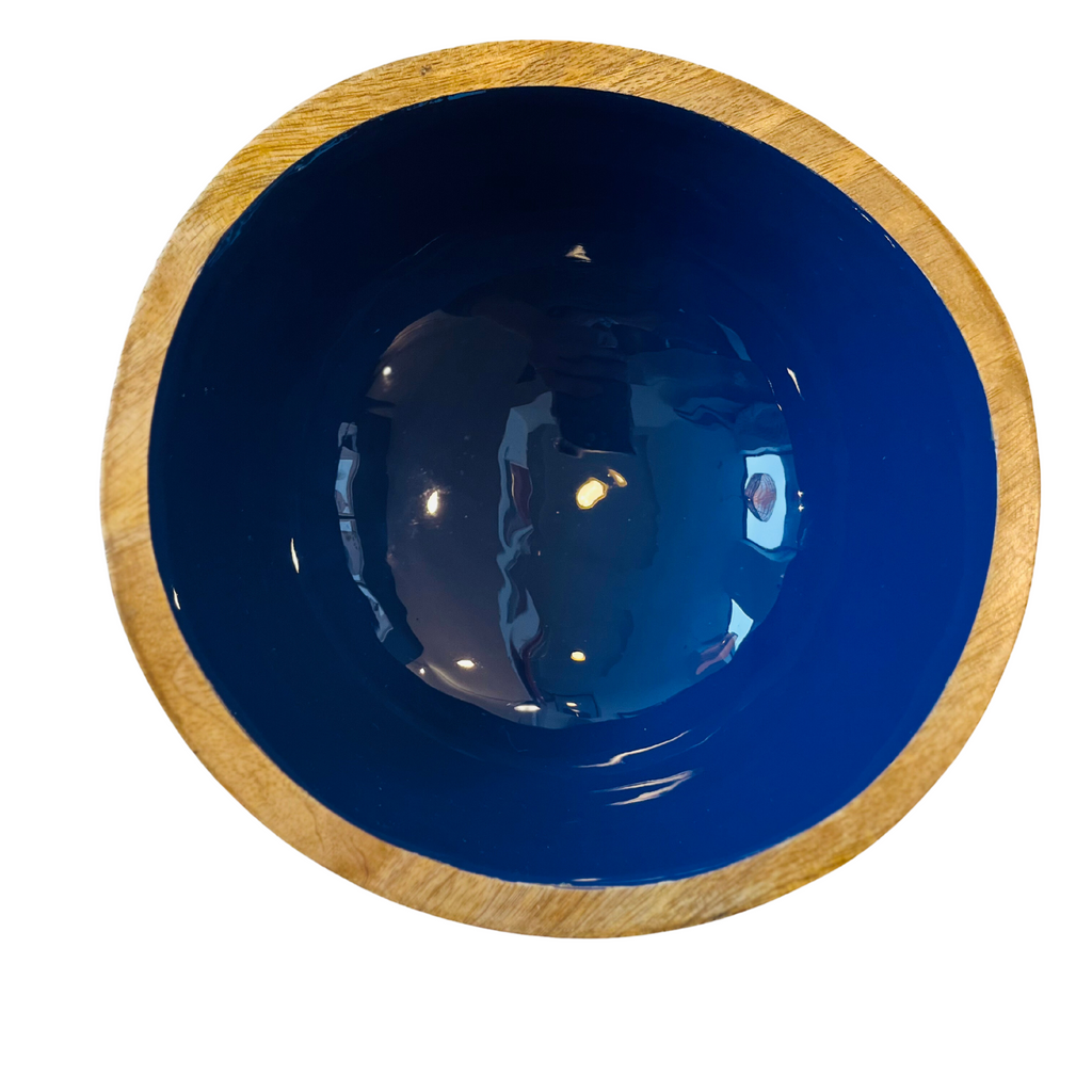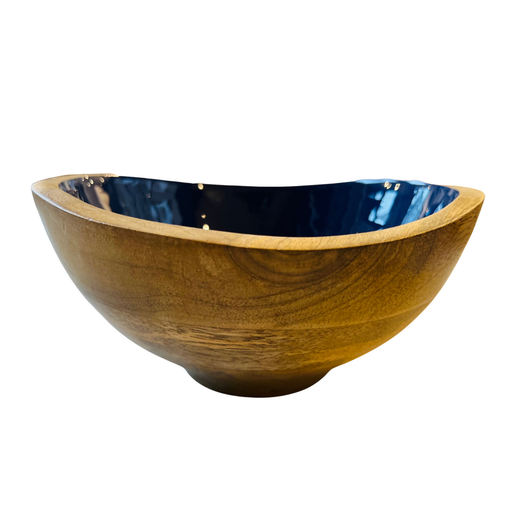 Designed by indy homeCrafted in IndiaColor Options: Natural/Navy BlueMaterials: Ethically sourced mango wood; Food safe enamelSize Options: L: 17"l x 17.5"w x 5"hCare: Hand wash with mild soap. Not dishwasher safe