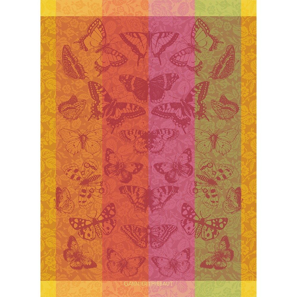 The Beaux Papillons Flamboyant Jacquard Kitchen Towel by Garnier Thiebaut showcases a variety of butterflies fluttering over a floral and leaf background in vibrant yellow, orange, pink, and green. Hand-drawn by French artisans and woven from extra-long staple cotton, it offers both beauty and lasting durability.