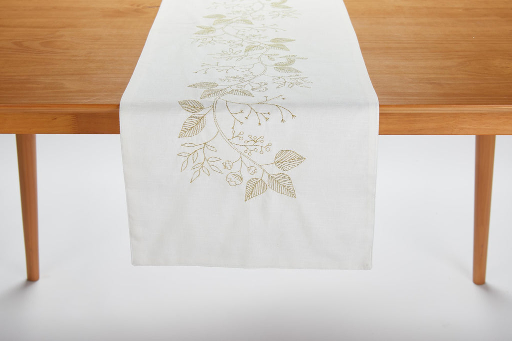 Style your table with seasonal elegance! This 100% cotton table runner features Tableau-exclusive artwork—a gold embroidered garland pattern with floral embellishments. You can pair it with items in our Holiday collection for a winter-wonderland tablescape, or use it as a cozy complement to your everyday decor!