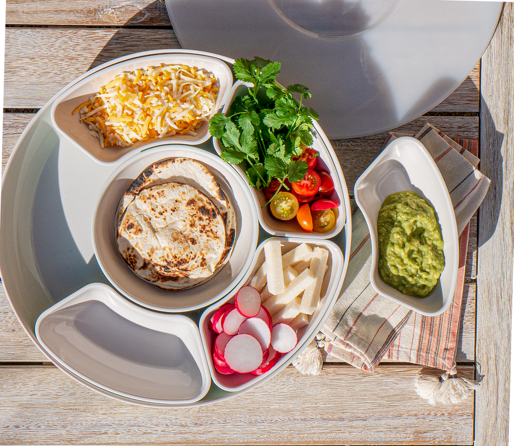Six sectioned bowls fit perfectly into a rotating lazy susan base for easy serving. All in durable polypropylene. A clear lid snaps on for portability.