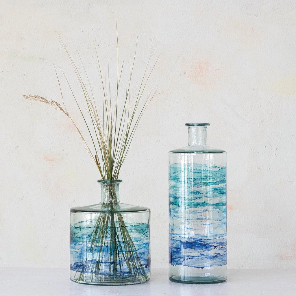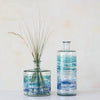 This hand-painted reclaimed glass vase is a lovely and eco-friendly piece that is made of reclaimed glass from old bottles and jars. The glass is reused and handcrafted by skilled artisans who create a unique and sustainable product. The vase has a blue ombre effect that gives it a gradient look from light to dark blue. The vase has a round shape that gives it a simple and elegant look.