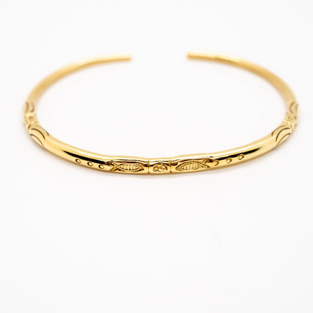 Decorated brass bangle bracelet with fish design. Handmade by skilled metalsmiths in Rajasthan, India