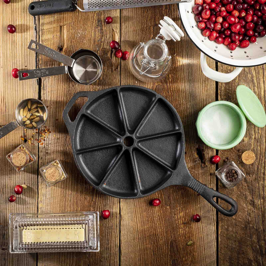 Cornbread may be a Southern staple, but with this pre-seasoned cast iron skillet you can cook any sweet cake, bread, savory casserole, or frittata. The cast iron cooks evenly and the segmented skillet makes 8 pre-divided 3 oz wedges so serving up warm and delicious food in your kitchen is as easy as pie.