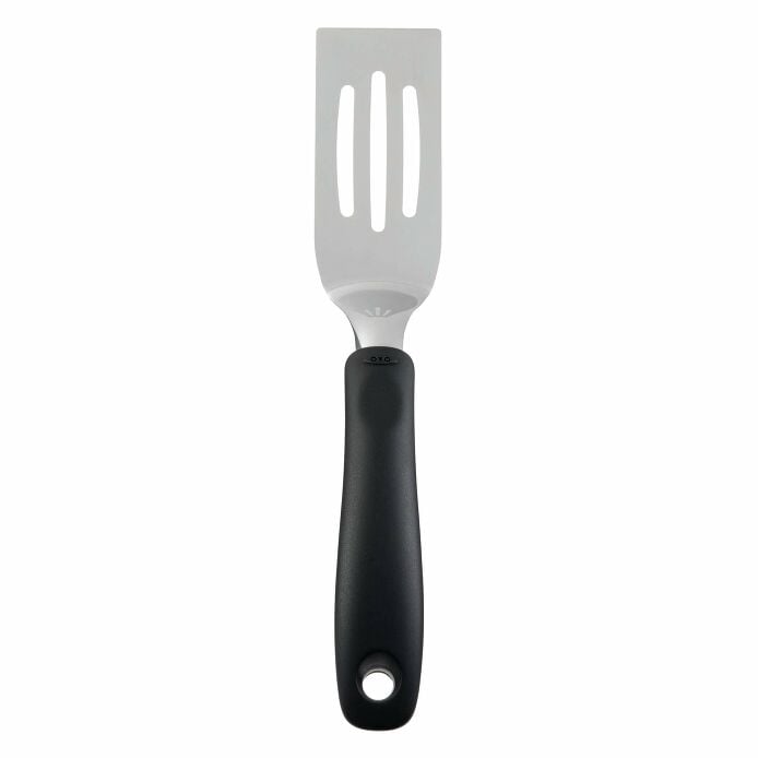 Our Cut & Serve Turner features a sharp front edge and flat, beveled head to easily portion out lasagna, brownies, and more. Slotted head drains excess oil or sauce, preventing food from sticking. Thumb and finger indentations on the contoured handle provide a comfortable grip in any position.