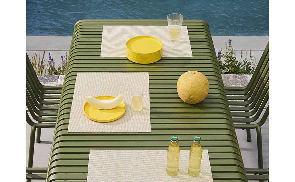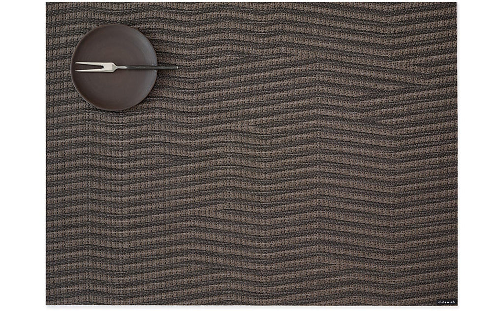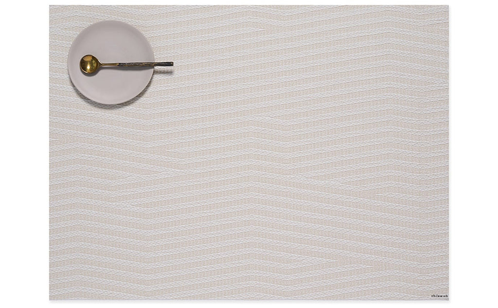 Tonal hues and softened angles bring a calming character to Dune, named for its resemblance to lines etched in sand. The Chilewich design team combined multiple weave structures to achieve an especially tactile surface, with meandering stripes of varying heights. The large scale of Dune's repeat makes each placemat unique.