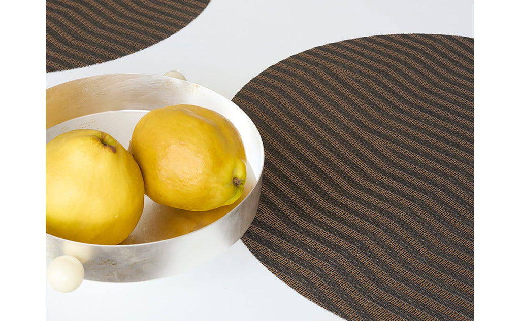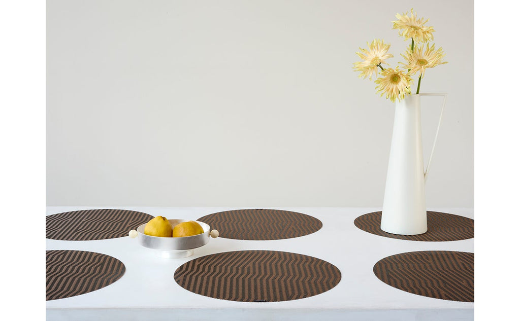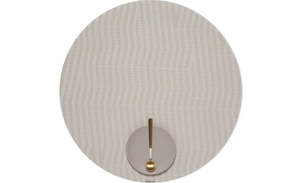 Tonal hues and softened angles bring a calming character to Dune, named for its resemblance to lines etched in sand. The Chilewich design team combined multiple weave structures to achieve an especially tactile surface, with meandering stripes of varying heights. The large scale of Dune's repeat makes each placemat unique.