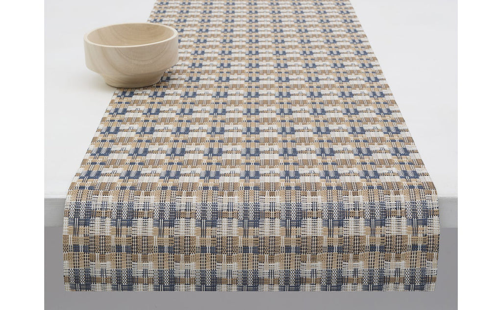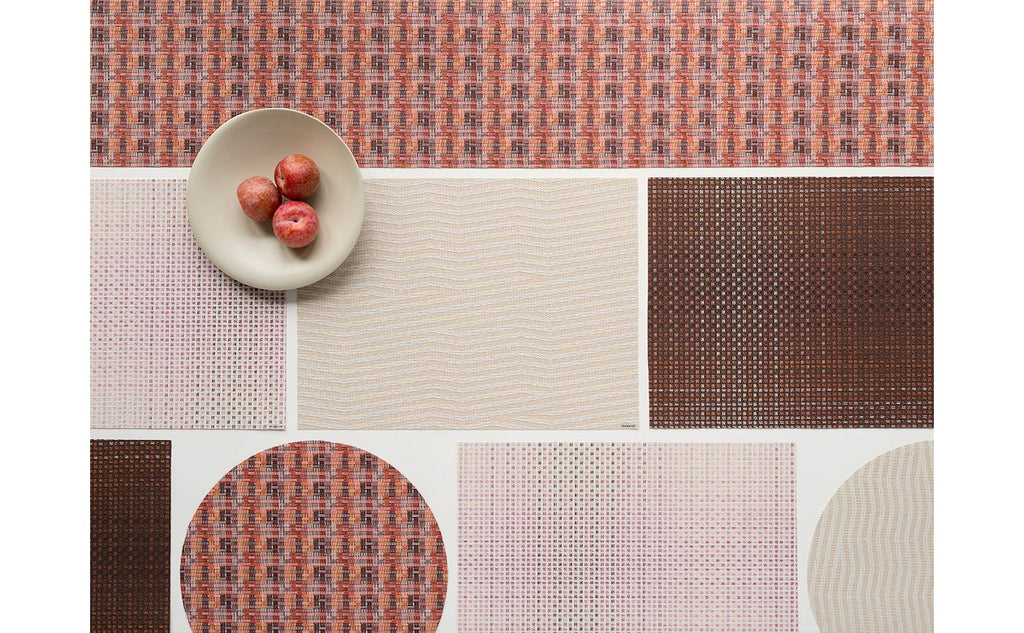 Rich texture comes to the fore in Fable, in which staggered densities and multi-tonal colors create multifaceted stripes. This dynamic design resembles the handmade textiles created by collecting the "selvedge" of Chilewich fabric from the factory floor and weaving the ribbon-like strips into one-of-akind pieces.