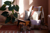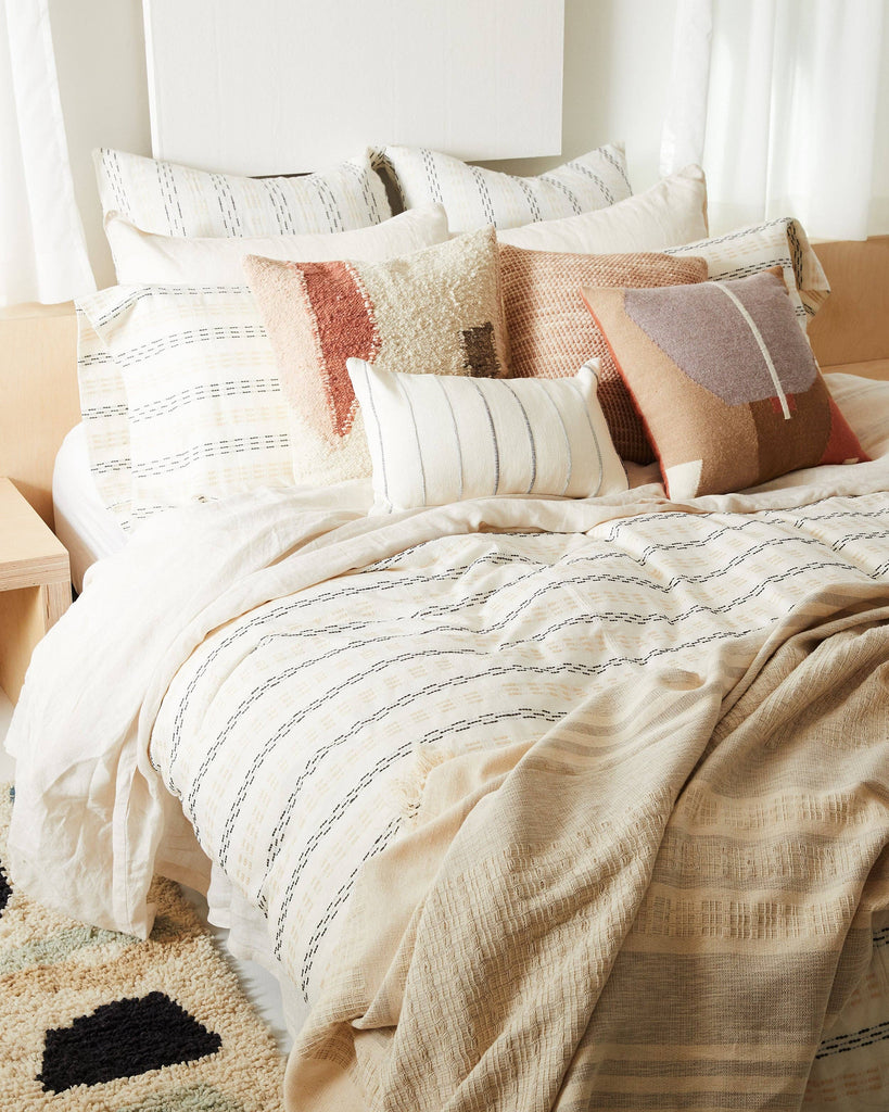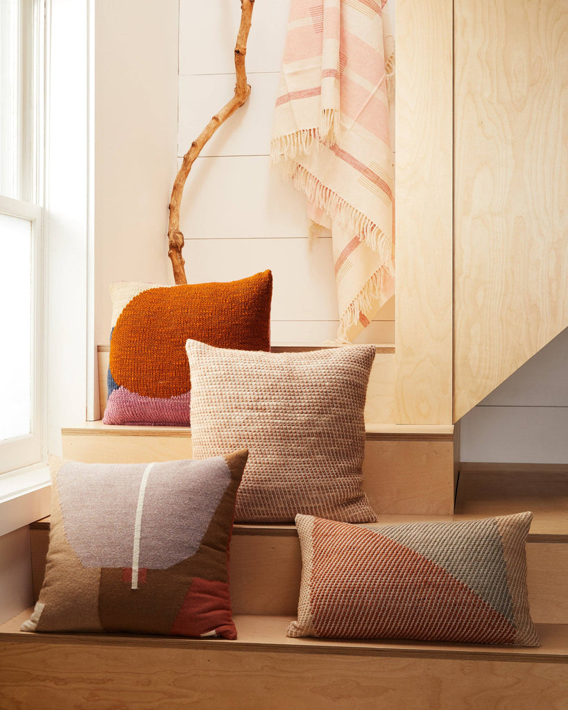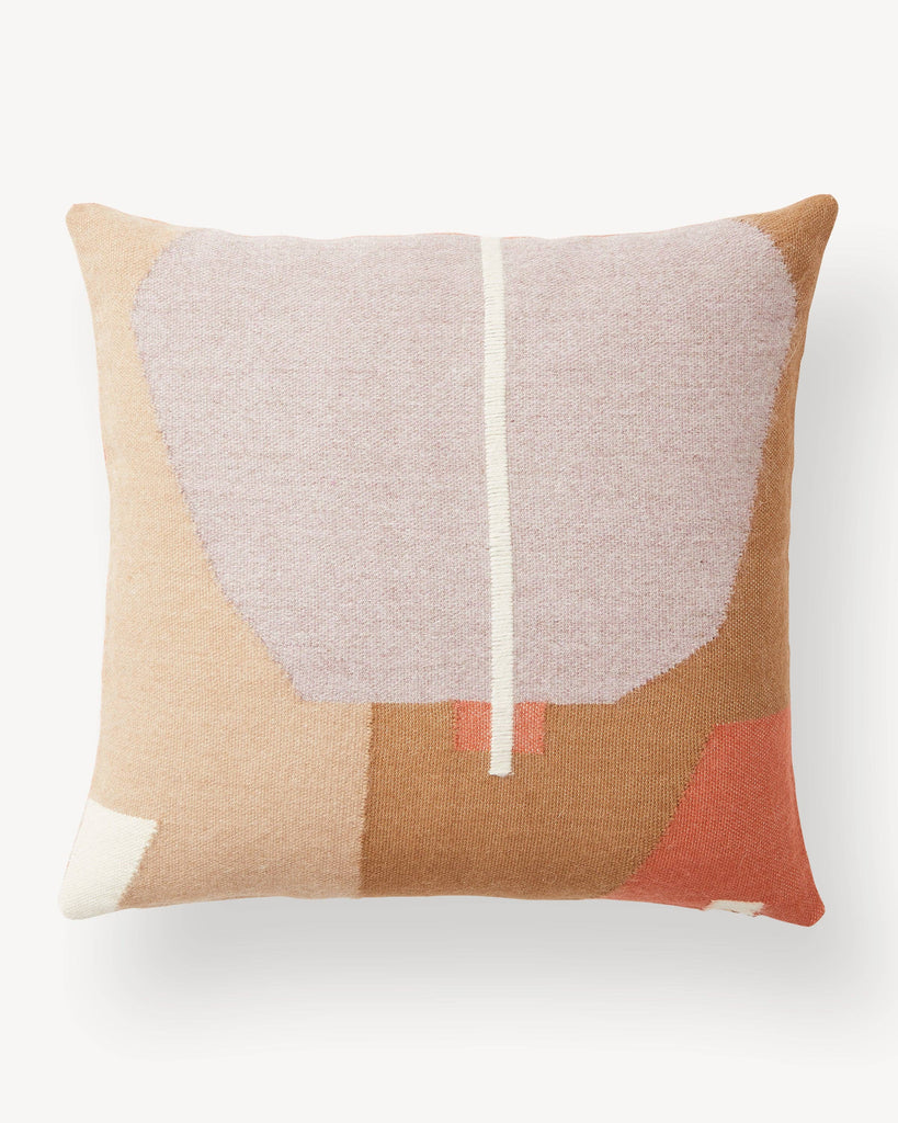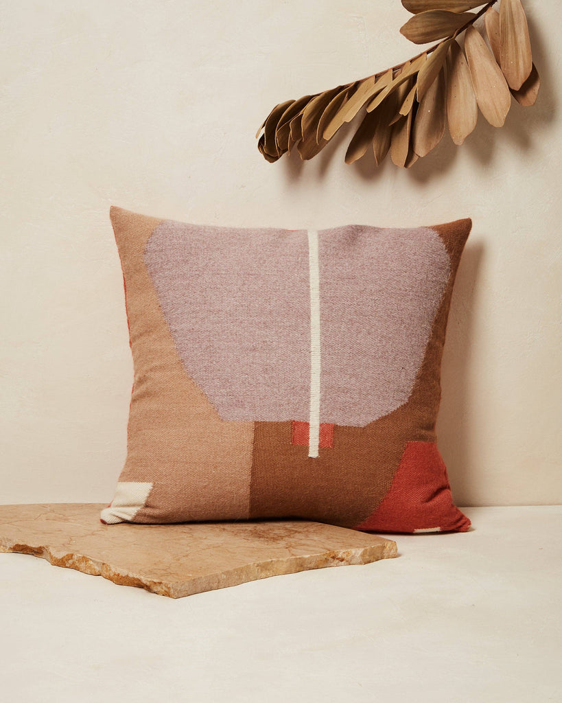 Product Story Playful Geometry. The Julie Pillow in Terracotta is named after the artist Julie Mehretu. This ultra-soft pillow is handwoven by an artisan co-op in Lima, Peru out of 100% alpaca wool. It features a detailed embroidered stripe and a contrasting backside in a solid terracotta color.
