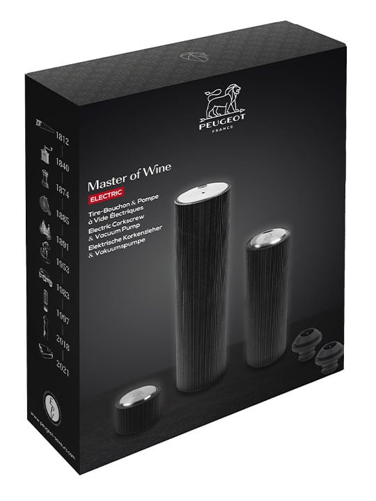 Peugeot's signature contemporary wine set combines Line Reverse and Line Preserve . A sleek, graphic design that balances elegance and technology. Equipped with a latest-generation Lithium-ion battery, the 100% automatic Line Reverse corkscrew makes uncorking a pleasure, and for those who don't finish the bottle, the Line Preserve electric pump prolongs the quality of the wine for several days.