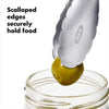 The scalloped edges hold food securely, so you can cook with them, too. The tongs lock closed for easy storage. They are dishwasher safe.