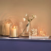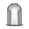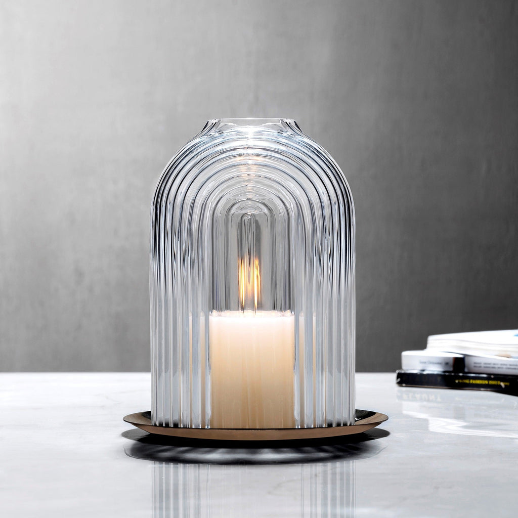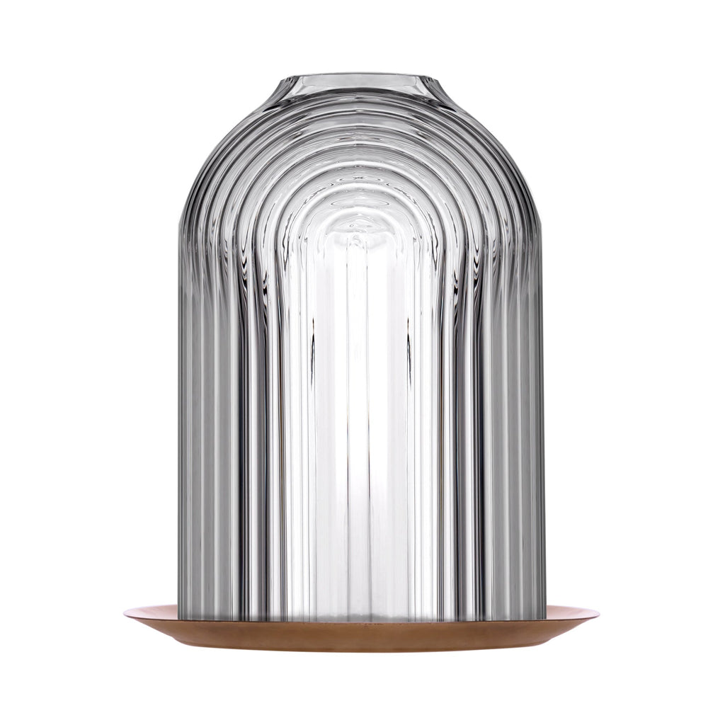 Perfect for indoor and outdoor displays, this medium NUDE Ilo candle holder comprises a clear crystalline dome, enriched with a hand-engraved ripple pattern, resting atop a light-reflective copper base. It can be used alone or combined with other pieces from the range for a captivating effect.