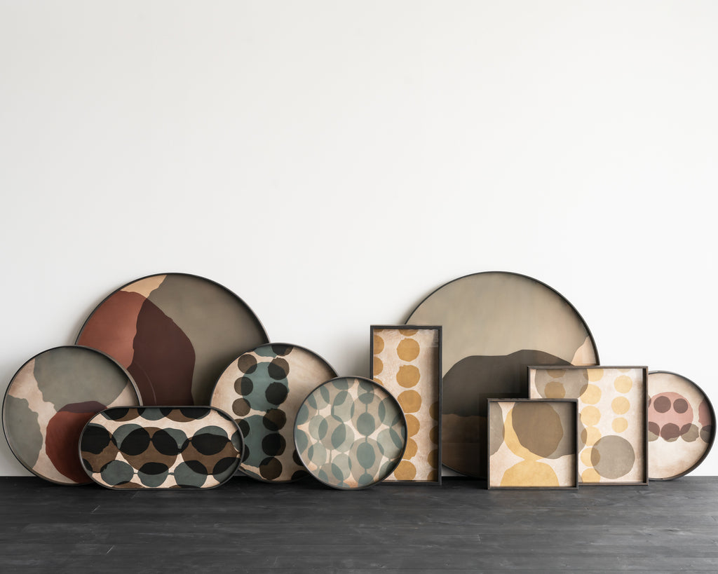 The Translucent Silhouettes collection of trays artfully layers organic dots atop an aged surface, creating a sense of depth and allowing dynamic combinations to blossom. While the overall result is bold, the collection possesses certain lightness conveyed by the delicate inks and pigments.