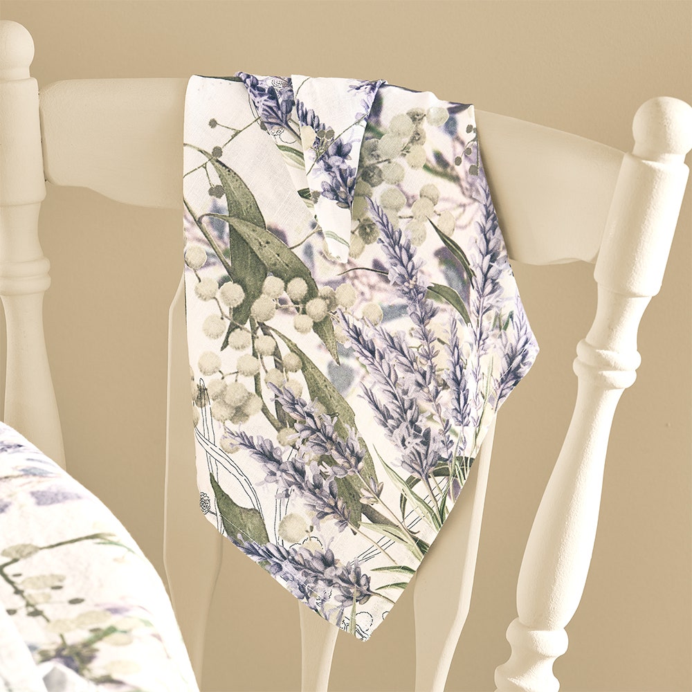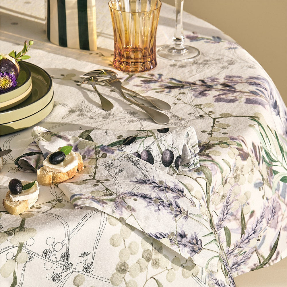 The fragrance of lavender and the beauty of florals and leaves dancing in the breeze are depicted in shades of white, green, and purple on the Parfum De Lavande Mauve Napkin by Garnier Thiebaut. Designed by our in-house French artisans, this printed cotton-linen blend napkin blends the softness of cotton with the durability of linen, offering a timeless and elegant table accent.