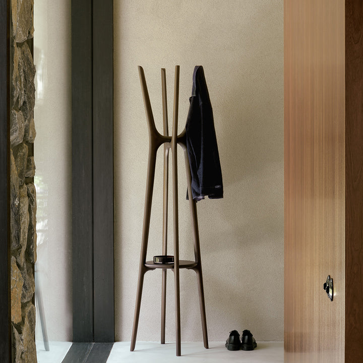 The PI coat rack honors nature’s design by keeping the strength, curves, and lines, as Mother Nature intended. Each is finished by hand to ensure that the individual character of the wood is respected. A unique organic modern Japandi furniture design that’s perfect for the bedroom or entryway. Designed by Alain van Havre.