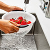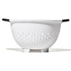 The OXO Good Grips 3-Qt/2.8-L Colander is an efficient tool for rinsing veggies and straining pasta. Contoured feet keep Colander steady in sinks, and the non-slip handles provide a comfortable grip, even when your hands are wet. The elevated design keeps colander away from the bottom of the sink to prevent pooling. The sturdy construction can handle heavy food and the smooth material is easy to clean. Dishwasher safe.