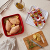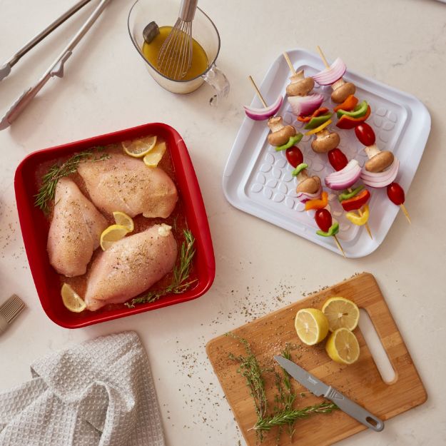 Prep, marinate, and serve your grilling dishes in one fell swoop with the 10.5" Prep & Serve Marinade Tray Set. Featuring a white tray and chili pepper base.