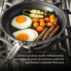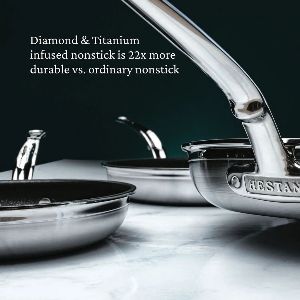 Finished with Hestan,s exclusive TITUM® nonstick system, this innovative cookware features a 5-layer system consisting of 3 layers of premium nonstick reinforced with diamond particles and anchored to the pots and pans with durable titanium plasma technology. Both frying pans and the 3.5-quart sauté are designed to provide a 20% larger cooking surface than traditional pans their size, and just like the 3-quart saucepan and 8-quart stock pot, they are quick to heat and ideally weighted. The saute, saucepan, and stock pot are all matched with a clad stainless steel lid to lock in heat and drive incredible flavors. All the pieces feature ergonomic handles secured with flush rivets to provide a firm, comfortable hold when cooking or serving. Durable and versatile clad construction is dishwasher safe for convenient cleanup and oven/broiler safe to 600°F for stove to oven cooking.