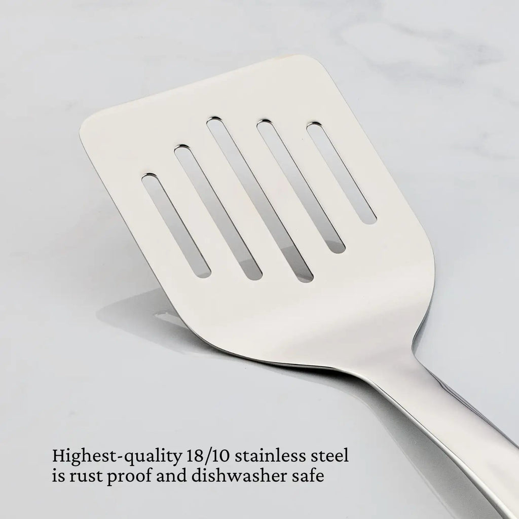HIGHEST-GRADE STAINLESS STEEL: This 13-inch slotted turner is crafted from the highest-grade 18/10 stainless steel, for a reliable kitchen spatula that won’t dent, rust, or bend - even after years in the kitchen.