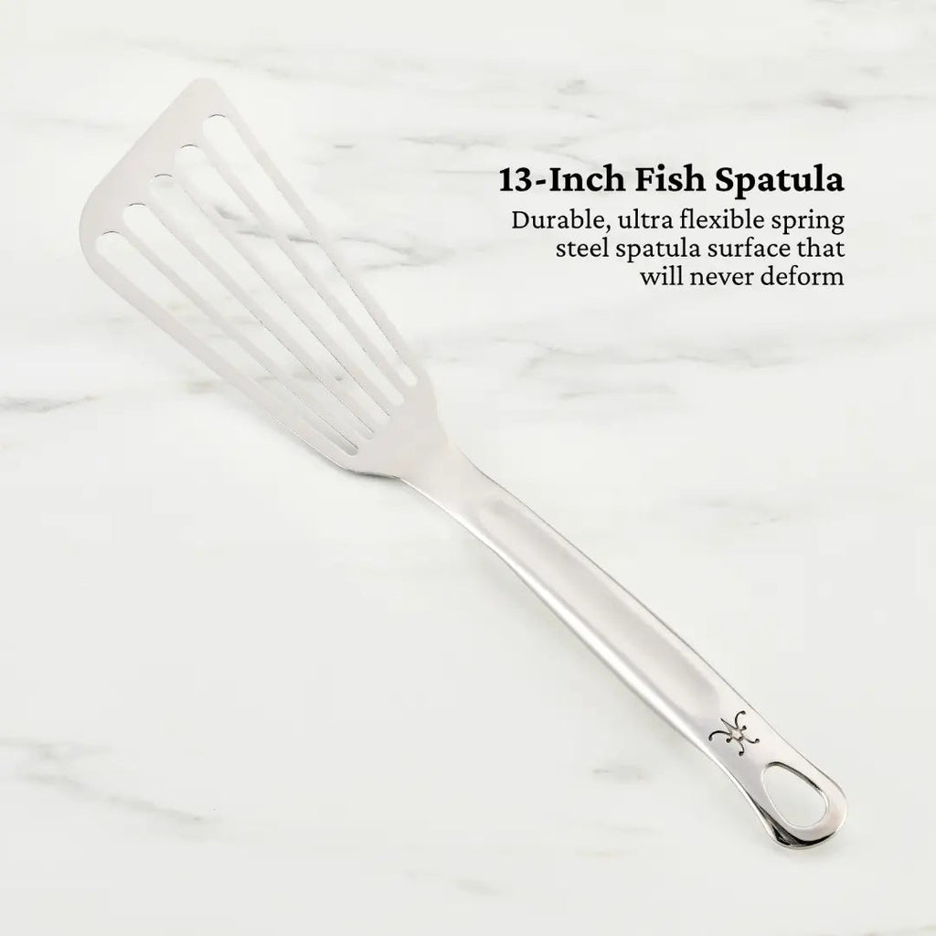 HIGHEST-GRADE STAINLESS STEEL: This set of 13-inch kitchen tools is crafted from the highest-quality 18/10 stainless steel, for a reliable set of kitchen utensils that won’t dent, rust, or bend - even after years in the kitchen.