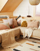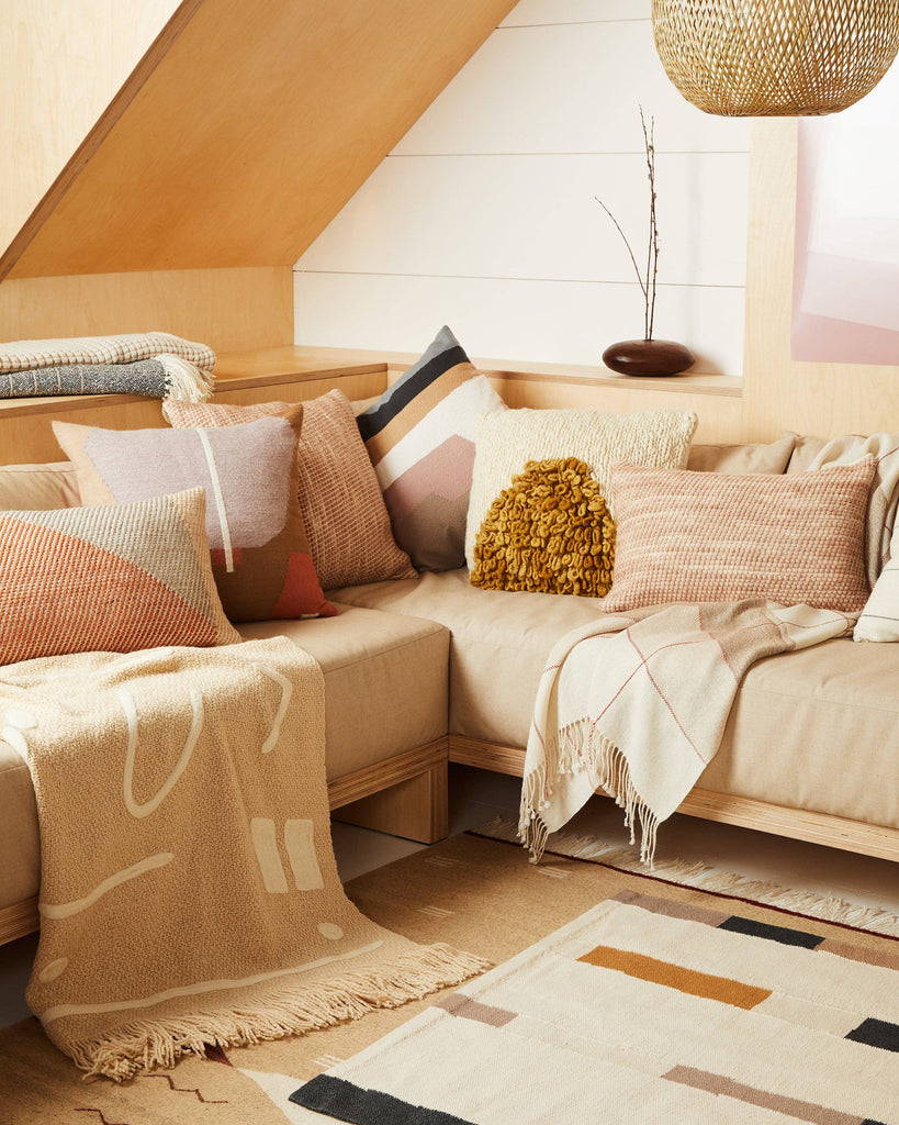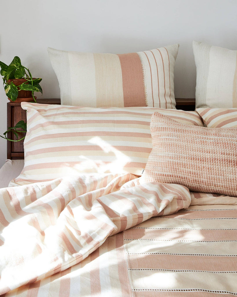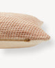 Product Story The texture of the Sheila Pillow was inspired by the ruins of Huaca Pucllana and named after Sheila Hicks. It is an easy way to incorporate texture into any room. The salmon color is 100% natural, derived from plants and flowers harvested in Peru and is certified GOTS for eco-dyeing. The merino is 100% handspun by a women-led co-op and then handwoven by an artisan co-op in Lima, Peru.
