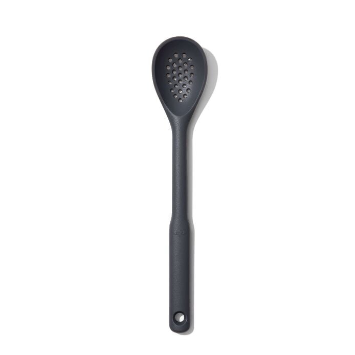This slotted spoon is designed with a rounded shape to fit perfectly against the curves of pots and pans, so you never miss a bit as you work. High heat-resistant silicone allows you to scoop and strain pasta or veggies from pots and pans. The slotted spoon's polished, flexible edges glide across non-stick cookware without scratching. Closely spaced holes allow small ingredients like beans and peas to drain quickly, and the soft, non-slip grip stays comfortable in hand as you stir. Dishwasher safe.