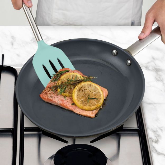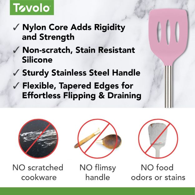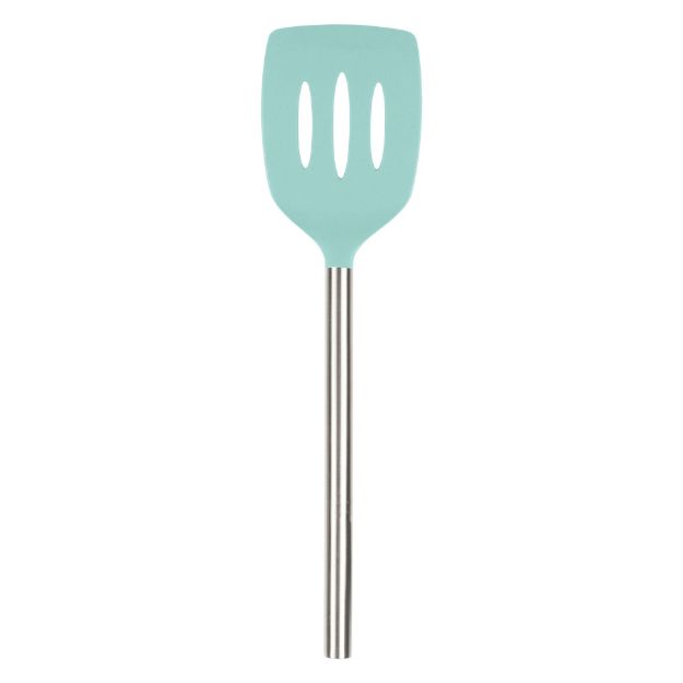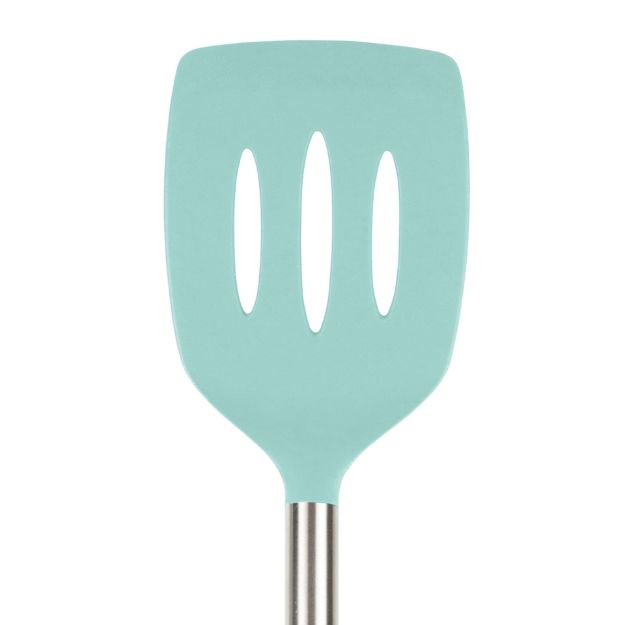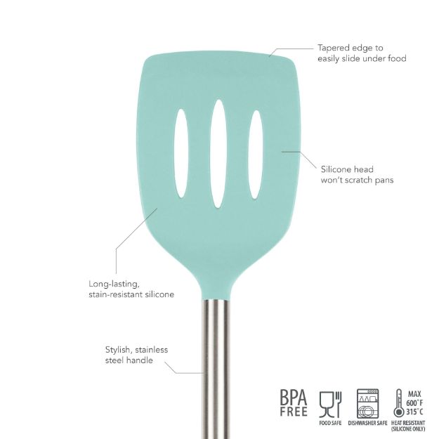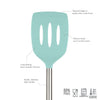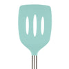 The Silicone Slotted Turner has tapered edges that allow the turner to slide under food easily, while the stainless steel handle provides extra strength when lifting.
