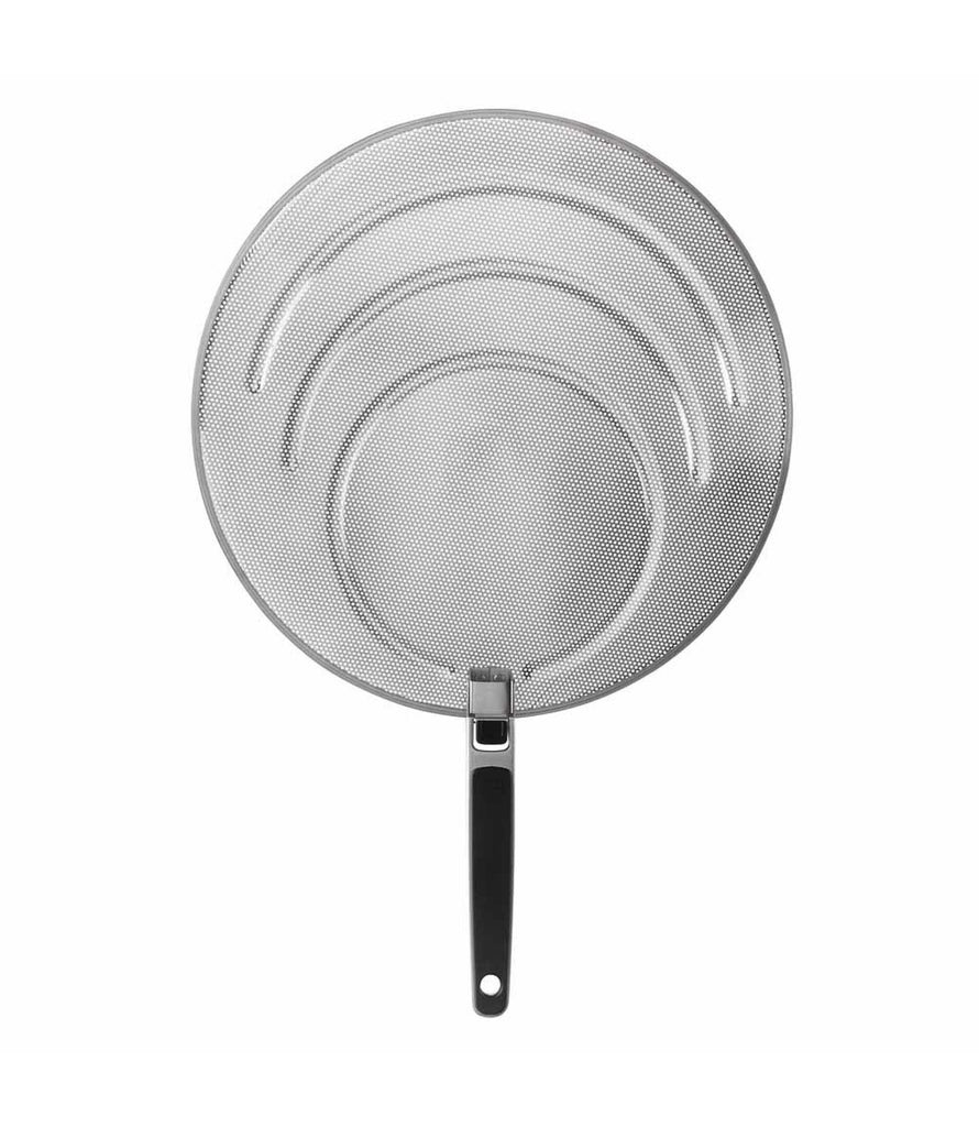 Made of perforated stainless steel, our Splatter Screen keeps grease off of countertops, stoves and, most importantly, cooks. Fits pans up to 13 inches wide, with grooved rings to rest on different sized pans. The soft handle locks in the open position and folds down for compact storage.